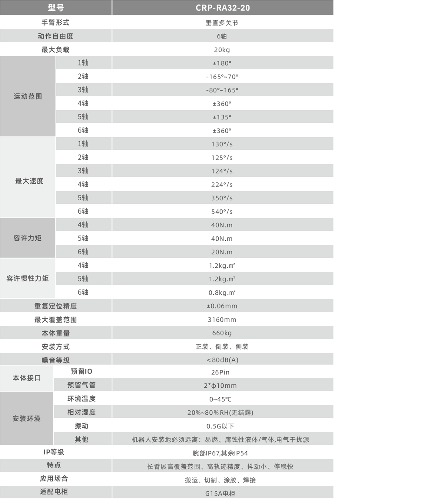 内置电缆、气管,通过小臂和手腕中心处设置中空部分,从机器人基部到腕部未端内置电缆和气管,更大地方便了用户使用,提高了作业效率。